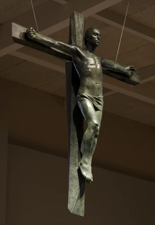 Two 66-inch tall oil portraits depicting Jean-Baptiste de La Salle and Mary of Nazareth are mounted on freestanding maple grids that bookend the sanctuary. Hanging above the altar is a 5-foot tall bronze crucifix. Representationally, Mary sits under dappled light in a garden. As you approach the painting her environment becomes abstracted. I designed this image as a tool for meditation. The viewer is drawn in to present focus through representation and then released into present awareness through abstraction. This oil portrait of John the Baptist de La Salle is designed around narrative. He sits in his study meditating on the rosary when students entering interrupt him. This image of Jesus is a transcendent image that moves away from an overtly suffering Jesus toward a moment of balance between the singular consciousness of the human nous, to the collective consciousness in everything. Jesus' body has subtle gesture that creates a slight forward movement but his eyes are closed to show his consciousness moving inward thru the portal of the heart's eye. Left in Latin is sinestra and it is feminine. His feminine hand is opening out toward his mother, Mary, depicted in the portrait on that side. The right hand represents consciousness. Jesus' right hand embraces consciousness through corporeal death.