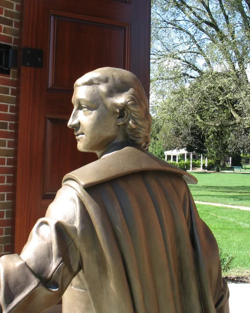 This life sized bronze statue of John Baptist de La Salle stands in front of a large arch monument to de La Salle at Lewis University, in Romeoville, IL.